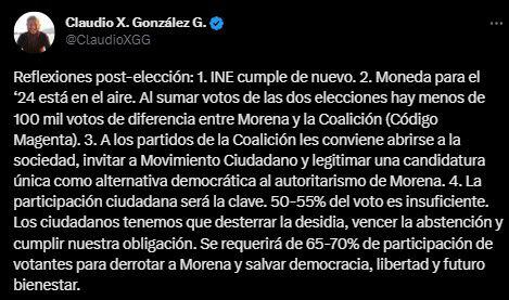 “Reflexiones post-elecciones: 1. INE cumple de nuevo. 2. Moneda para el ‘24 está en el aire. Al sumar votos de las dos elecciones hay menos de 100 mil votos de diferencia entre Morena y la Coalición (Código Magenta)”, fue la primera parte de sus reflexiones.