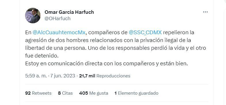 Aunque la Fiscalía General de Justicia de la Ciudad de México (FGJCDMX) inició una carpeta de investigación por los hechos acontecidos la noche del pasado martes, fue el titular de la Secretaría de Seguridad Ciudadana (SSC), Omar García Harfuch, quien se pronunció a través de sus redes sociales para felicitar a los elementos de la dependencia que encabeza por su labor. Así como para dar parte de los hechos.