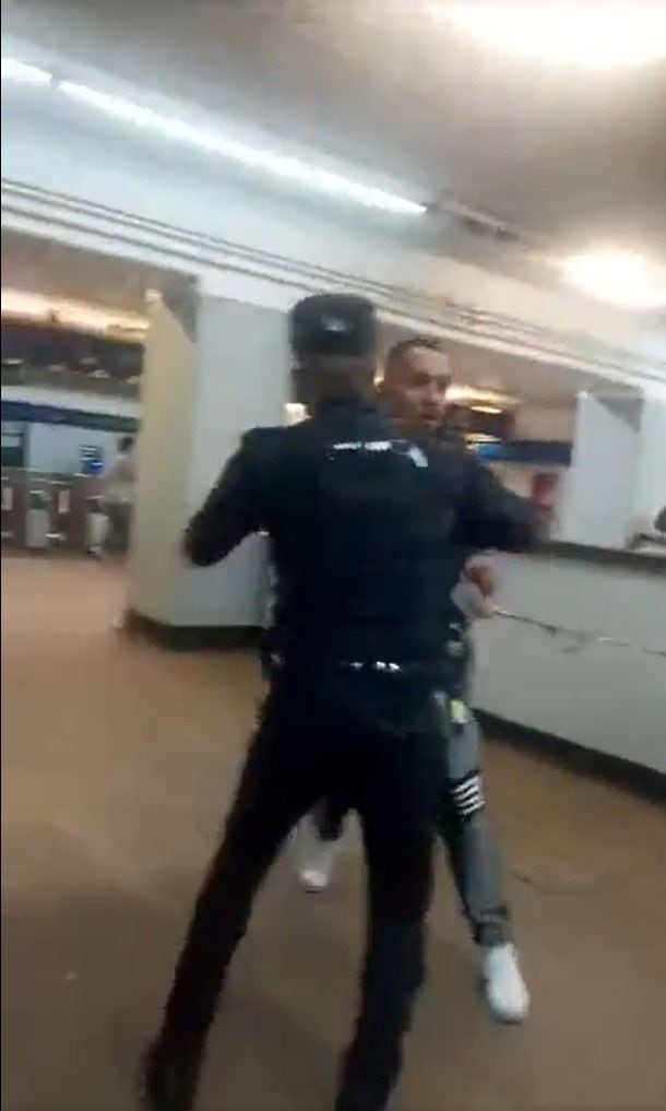 En medio de los dos se observa a un elemento de la Policía Bancaria e Industrial (PBI) que intenta evitar la agresión entre los comerciantes informales. Del mismo modo, al fondo se observan a personas que ya comenzaron una pelea física mientras al menos dos mujeres recogen del piso lo que parece ser la mercancía que venden al interior de los trenes del Sistema de Transporte Colectivo (STC), Metro.