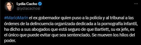 “#MarioMarin el exgobernador quien puso a la policía y al tribunal a las órdenes de la delincuencia organizada dedicada a la pornografía infantil, ha dicho a sus abogados que está seguro de que Bartlett, su ex jefe, es el único que puede evitar que sea sentenciado. Se mueven los hilos del poder”, redactó.