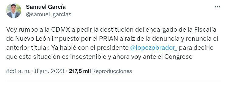 “Voy rumbo a la CDMX a pedir la destitución del encargado de la Fiscalía de Nuevo León impuesto por el PRIAN a raíz de la denuncia y renuncia el anterior titular. Ya hablé con el presidente @lopezobrador_ para decirle que esta situación es insostenible y ahora voy ante el Congreso”, posteó en su red social.