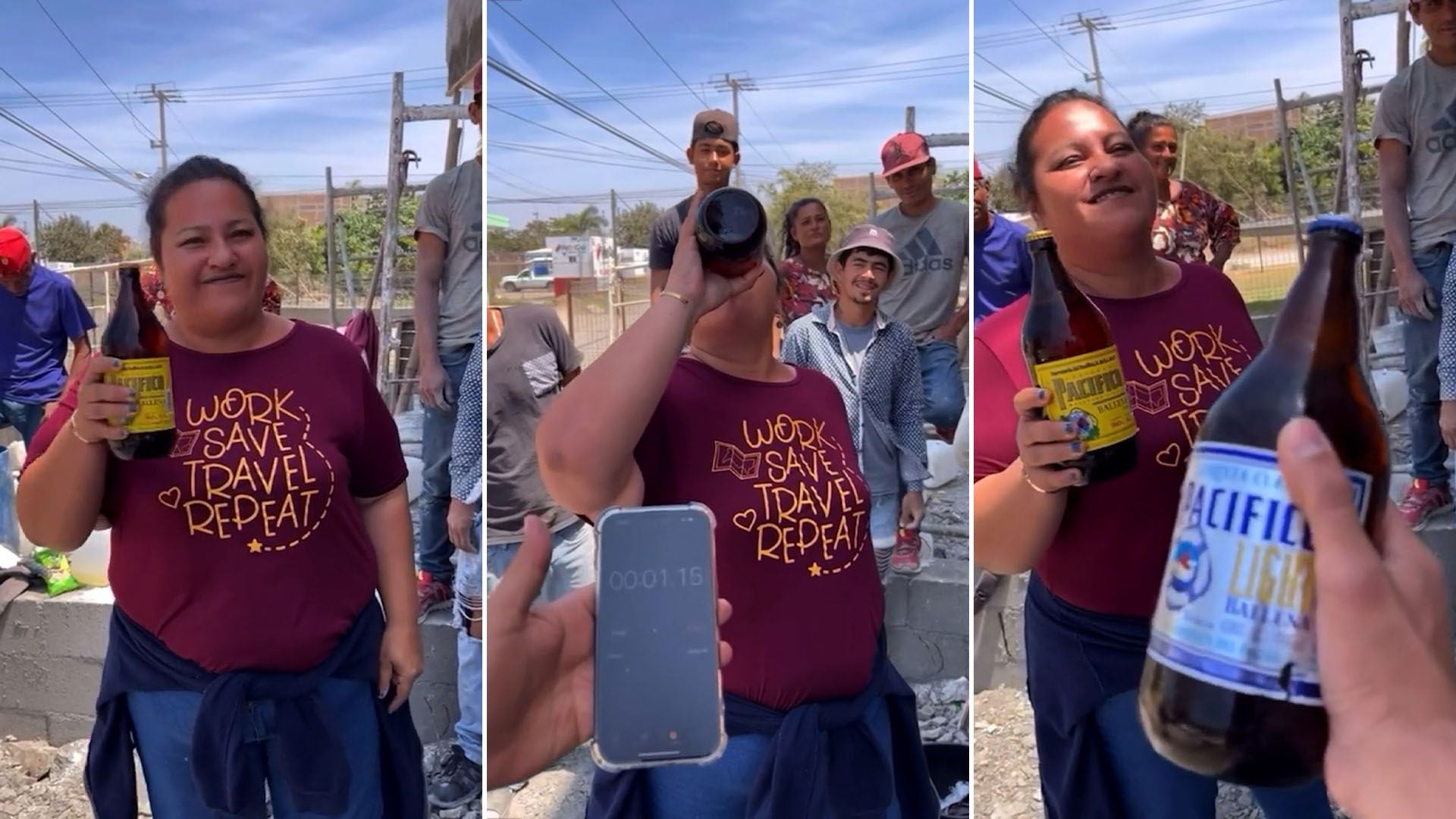 Una grabación subida a la red social muestra como la mujer fue a retar a unos albañiles al interior de una obra, ofreciendo una recompensa de tres mil pesos si consiguen batir el récord que ella tiene. En el clip se puede ver como doña Chela consigue tomarse una cerveza de 1.2 litros en solo 18 segundos, siendo esa la marca que deberán superar los trabajadores.