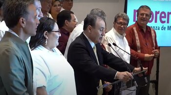 Mario Delgado, Alfonso Durazo y Citlalli Hernández ofrecen una conferencia de prensa para dar a conocer los acuerdos alcanzados.