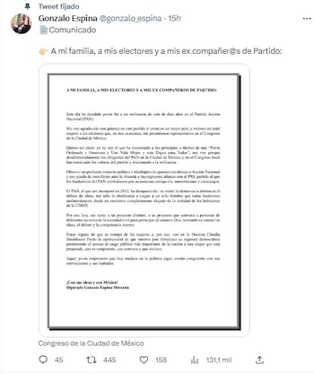 Por medio de un comunicado, que compartió en sus redes sociales, Espina señaló que luego de 10 años, decidió poner fin a su militancia en el PAN, y señaló irse agradecido con quienes en ese partido sí creen en un mejor país. “Externo mi total respeto a los electores que, en dos ocasiones, me permitieron representarlos en el Congreso de la Ciudad de México”.
