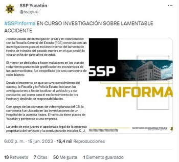 “Desde el momento en que se tuvo conocimiento del suceso, la Fiscalía y la Policía Estatal iniciaron las averiguaciones a fin de localizar al vehículo y a su conductor, así como para el esclarecimiento de los hechos y deslinde de responsabilidades”, señaló la Secretaría de Seguridad Pública de Yucatán.