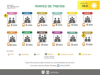 La cuenta oficial del metro de la Ciudad de México informó que debido al pronóstico del clima en la capital, durante la tarde y la noche hay probabilidad de lluvia y, por lo tanto, los trenes disminuirán su velocidad. Es recomendable que los usuarios tomen sus respectivas previsiones.