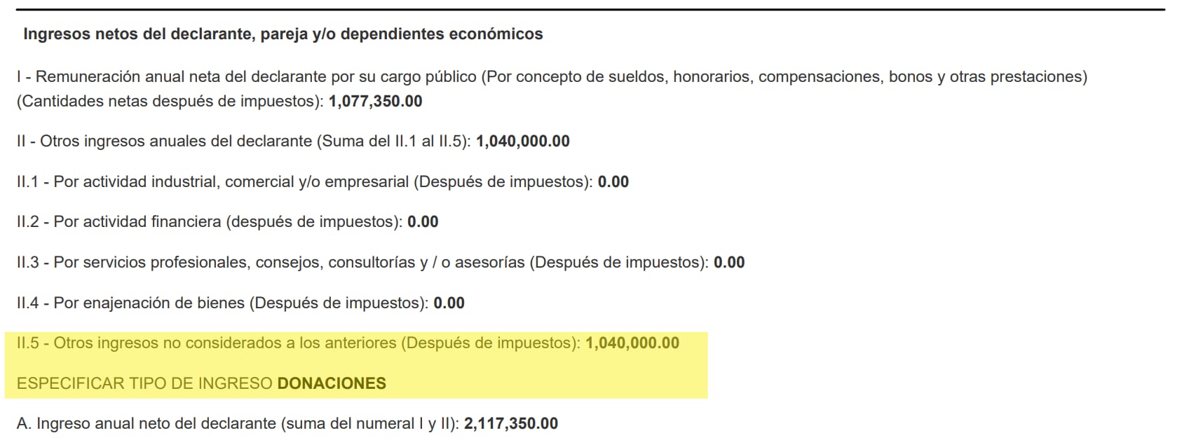 En el apartado de ingresos, García Harfuch añadió un millón 400 mil pesos como “otros ingresos” bajo el concepto de “donaciones”.