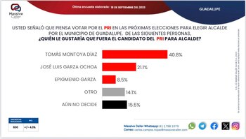 De acuerdo con Massive Caller, el tricolor se ha posicionado como el favorito al obtener el 40.8%. la pregunta expresa ¿quién le gustaría que fuera el candidato del PRI para alcalde?, los encuestados posicionaron a Tomás Montoya en la cabeza de la lista, seguido por José Luis Garza Ochoa, del mismo partido, con el 21.1 por ciento.