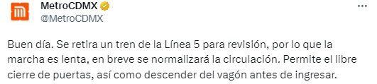 Usuarios reportan la falta de transporte en la Línea 5 del Metro de la CDMX, autoridades informan que tuvo que ser retirado uno de ellos para su revisión.