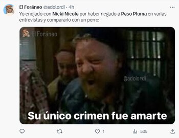 “Nadie insulta y niega a nuestro Peso Pluma”, “Con Hassan no”, “Soldado caído, él si la amaba”, “Se dejó ganar por su inconsciente y expresó lo que verdaderamente piensa de Peso Pluma”, “Pobre Peso Pluma, está roto”, fueron algunos de los mensajes que circularon en la red social X (antes Twitter). De esa manera fanáticos del tapatío mostraron su empatía en caso de que aquella relación fuera real o no.