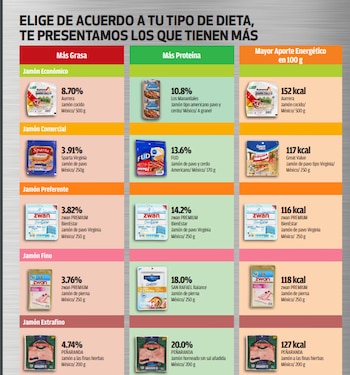 San Rafael - Jamón Real de Pavo de 300 gramos: esta marca se ha destacado como la mejor en su categoría. Una porción de este jamón contiene aproximadamente 2.20 gramos de grasa, con una proteína libre de grasa que representa el 15 por ciento y un aporte calórico de 101 kilocalorías por cada 100 gramos del producto.
