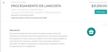Los requisitos fundamentales para optar a este empleo con un salario de 21 mil pesos al mes incluyen un nivel de escolaridad de primaria, así como una experiencia previa de seis meses a un año en el procesamiento de langostas.