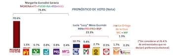 El ejercicio realizado hasta el 22 de diciembre revela, por otra parte, que la precandidata única de la oposición, conformada por el PRI-PAN-PRD y RSP, Lucía Lucy Meza, obtuvo una intención de voto neto del 23.3%, seguida de Jessica Ortega de la Cruz, representante del Movimiento Ciudadano (MC) y Morelos Progresa, quien se colocó en último lugar con el 1.9% de preferencias.