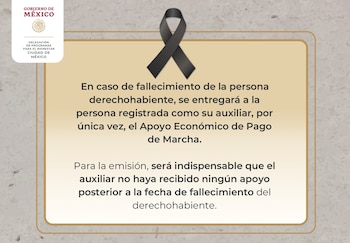 El Pago de Marcha es un apoyo económico único otorgado a los familiares o representantes de una persona beneficiaria del programa Pensión para el Bienestar en el momento de su fallecimiento. Este beneficio aplica tanto para adultos mayores como para personas con discapacidad permanente.