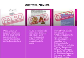 El proceso electoral 2024, también cuenta con la implementación del proyecto “Certeza INE 2024″ cuyo objetivo es combatir las fake news, aclarando o desmintiendo la información que pueda poner en riesgo el desarrollo del Proceso Electoral o que ponga en duda la credibilidad del INE. Esto se hace a partir del monitoreo en redes sociales y medios tradicionales con el fin de detectar las noticias falsas. La consulta de la información verificada por “Certeza INE 2024″ se puede realizar a través de distintas plataformas, por ejemplo: en la página del INE en la liga https://tinyurl.com/48cayccc, en la red social “X” en https://tinyurl.com/u4vk6y3z y también en Facebook en https://tinyurl.com/5xrjxkua.