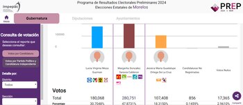 El Programa de Resultados Electorales Preliminares (PREP) presenta la cantidad de votos y porcentaje que ha obtenido cada una de las tres candidatas a la gubernatura del estado de Morelos.