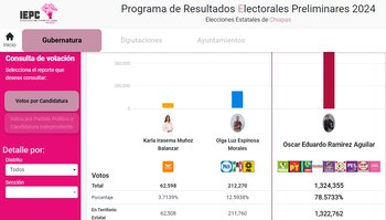 El Programa de Resultados Electorales Preliminares (PREP) informa sobre la cantidad de votos y el porcentaje que han obtenido las candidatas y el candidato que compiten por la gubernatura del estado de Chiapas.