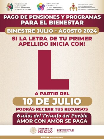 Este miércoles 10 de julio, las personas cuyos apellidos inicien con la letra “L” tendrán la oportunidad de cobrar su pensión. Este es uno de los días programados de acuerdo al calendario establecido por Ariadna Montiel Reyes, Secretaria de Bienestar del Gobierno de México, quien anunció previamente el plan de distribución para evitar aglomeraciones y facilitar el acceso de los beneficiarios a sus recursos.