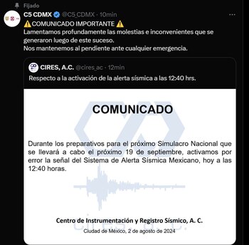 Por su parte, fue el Centro de Comando, Control, Cómputo, Comunicaciones y Contacto Ciudadano de la CDMX (C5), publicó un comunicado del Centro de Instrumentación y Registro Sísmico, A.C. (CIRES), para aclarar que FUE UN ERROR.