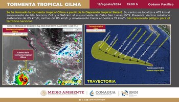 La tarde de este domingo se formó la Tormenta Tropical Gilma a 475 km al sur-suroeste de Isla Socorro, en Colima, y a 945 km al sur-suroeste de Cabo San Lucas, en Baja California Sur, confirmó el Servicio Meteorológico Nacional (SMN), el cual prevé que el jueves se convierta en huracán de categoría 1.