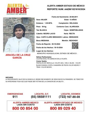 Resumen de los hechos: Araceli de la Cruz García fue vista por última vez el 19 de octubre de 2024 y vestía un pantalón de mezclilla color azul cielo, blusa color blanco con manga corta, chamarra de felpa color negro y tenis negros.