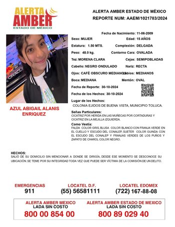 Resumen de los hechos: Azul Abigail Alanis Enriquez fue vista por última ve el 30 de octubre de 2024 en la colonia Ejidos de Buena Vista, municipio de Toluca. Vestía una falda color gris, blusa color blanco con franja verde en el cuello y escudo del Conalep, suéter color guinda con el escudo del Conalep y franjas verdes de los puños. Sus zapatos eran de charol color negro.