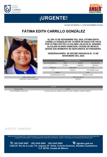 Resumen de los hechos: Fátima Edith Carrillo González fue vista por última vez, el día 12 de noviembre de 2024, en la colonia Jalapa el Grande, alcaldía Álvaro Obregón.