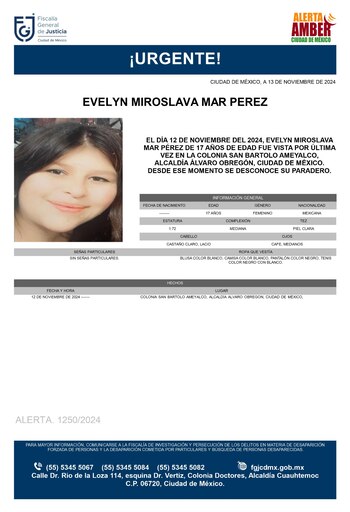 Resumen de los hechos: Evelyn Miroslava Mar Pérez fue vista por última vez el día 12 de noviembre de 2024, en la colonia San Bartolo Ameyalco, alcaldía Álvaro Obregón. Vestía blusa color blanco, camisa color blanco, pantalón color negro y tenis color negro con blanco.