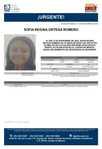 Resumen de los hechos: Sofía Regina Ortega Romero fue vista por última vez el día 13 de noviembre de 2024, en la colonia Reforma Iztaccíhuatl Norte, alcaldía Iztacalco. Vestía uniforme escolar, blusa color blanco tipo polo con franjas azules en cuello, pants color azul con franjas amarillas.