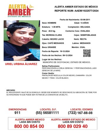 La Fiscalía de Justicia del Estado de México activó la Alerta Amber para localizar a Uriel Urbina Álvarez