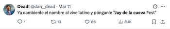“Cuando inventaron la chamba a Jay de la Cueva ya le debían 2 quincenas”, “Jay sin duda se sabe la de chambear”, “Ahorita ya debe tener mucho dinero”, “Ese Jay de la cueva es todo un héroe”, “Imaginate ser Jay de la Cueva en esta vida llamada Vive Latino” y “Mañana no quiero venir al jale voy a mandar a Jay de la Cueva”, fueron algunos comentarios.