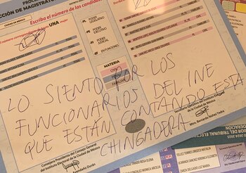 La desconfianza hacia las instituciones también se manifestó en expresiones más directas como “RIP al Poder Judicial” y “Mi oposición es leal a México”, escritas sobre distintas papeletas. En algunos casos, la crítica se dirigió al partido gobernante, como en la frase: “Esta reforma no es del pueblo, es de Morena”, o “Así no era la reforma”, en alusión a las promesas iniciales de transformación del sistema de justicia.