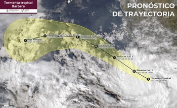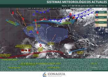 Las bandas nubosas de la tormenta tropical Barbara y el arrastre de humedad que genera ocasionarán durante este domingo, lluvias muy fuertes (de 50 a 75 milímetros [mm]) y viento de 40 a 60 kilómetros por hora (km/h) con rachas de 70 a 90 km/h en Jalisco, Colima, Michoacán y Guerrero, así como oleaje de 4 a 5 metros (m) de altura en Colima, Michoacán y Guerrero, y de 3 a 4 m en Jalisco.