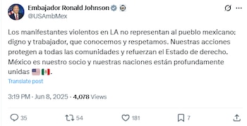 “Los manifestantes violentos en LA no representan al pueblo mexicano: digno y trabajador, que conocemos y respetamos. Nuestras acciones protegen a todas las comunidades y refuerzan el Estado de derecho. México es nuestro socio y nuestras naciones están profundamente unidas”, señaló el embajador Johnson.