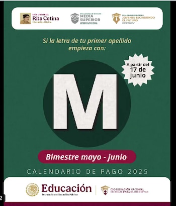 De acuerdo con el calendario oficial publicado por la Coordinación Nacional de Becas para el Bienestar Benito Juárez, este martes 17 de junio reciben su depósito las y los beneficiarios cuyo primer apellido comience con la letra M. Esta distribución por orden alfabético busca facilitar el acceso a los recursos y evitar aglomeraciones en cajeros y sucursales del Banco del Bienestar.