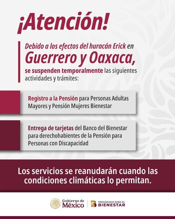 Ante el paso del huracán Erick por el sur del país, la Secretaría de Bienestar anunció la suspensión temporal de actividades en los estados de Guerrero y Oaxaca, con el objetivo de proteger la integridad física de la población, especialmente de los sectores más vulnerables.