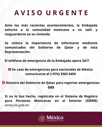 Después de que Irán lanzó al menos seis misiles sobre las bases militares de Estados Unidos situadas alrededor de la ciudad de Doha, la embajada de México en Qatar, exhortó a los mexicanos que se encuentran en esa nación a resguardarse en sus viviendas.