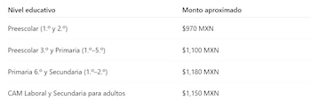 El monto del depósito varía de acuerdo con el nivel educativo del alumno. De acuerdo a datos del Fideicomiso Bienestar Educativo (FIBIEN), los apoyos establecidos para este año son los siguientes: