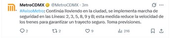 Continúa lloviendo en varias zonas de la Ciudad de México, por lo que el Metro implementa marcha de seguridad en las Líneas 2, 3, 5, 8, 9 y B, lo que implica reducción en la velocidad de los trenes para garantizar un trayecto seguro.