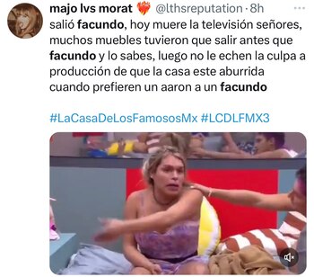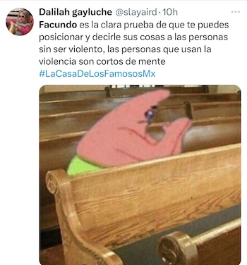 Al ser anunciada la eliminación de Facundo, la reacción en el set fue de sorpresa y nostalgia, mientras los usuarios replicaban imágenes de su salida con frases como “Hasta nunca, guerrero del desmadre” o “Se va el alma de la casa”. Otros memes contrastaron la euforia del grupo de Aarón Mercury —quienes celebraron con abrazos y aullidos— frente a la expresión resignada de los amigos de Facundo, principalmente Dalílah Polanco, Shiky y Guana.