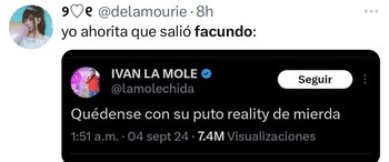 Entre los memes predominó el uso de capturas de Facundo al momento de enterarse de su eliminación, convertidas en stickers y reeditadas con frases como “Cuando te eliminan por los likes y no por las pruebas” o “La vida real también es contenido”. Otros usuarios aprovecharon para recordar pasajes memorables de la estancia del conductor en la casa, como sus bromas, retos y diálogos irónicos con celebridades y participantes.