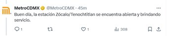 La estación Zócalo/Tenochtitlán se encuentra abierta y operando con servicio normal, informó el Metro de la CDMX.