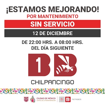 La estación Chilpancingo, también de la Línea 1, cerrará a partir de las 22:00 h de este viernes y reabrirá a las 08:00 h del sábado 13 de diciembre, debido a trabajos de mejora en su operación. Las autoridades exhortan a las personas usuarias a considerar rutas alternas durante dicho horario.