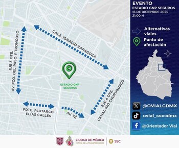 Considera afectación vehicular en inmediaciones del Estadio GNP Seguros, alcaldía Iztacalco, por evento a las 21:00 horas.