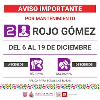 En la Línea 2, la estación Rojo Gómez se mantiene fuera de operación en ambos sentidos por mantenimiento. Este cierre se suma a las intervenciones mayores que el sistema ha venido realizando en esta estación durante diciembre, con el objetivo de reforzar la seguridad y funcionalidad de la infraestructura.