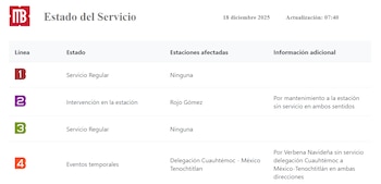 El Sistema Metrobús de la Ciudad de México informó que hoy jueves 18 de diciembre continuarán las afectaciones al servicio en una de sus líneas como parte del programa de mantenimiento escalonado que se implementa durante el mes con el objetivo de mejorar la seguridad y operación del sistema.