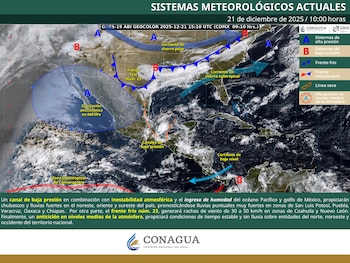 El frente frío número 23, extendido sobre el noreste, generará rachas de viento de 30 a 50 km/h en Coahuila y Nuevo León, y vientos de componente norte de 50 a 70 km/h en el istmo y golfo de Tehuantepec, afectando principalmente a Oaxaca y Chiapas.