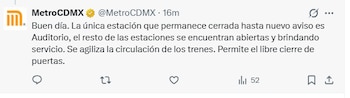 El Metro CDMX informa que la Línea 7 opera con normalidad, con excepción de la estación Auditorio, que permanece cerrada hasta nuevo aviso. El resto de las estaciones se encuentran abiertas y brindando servicio