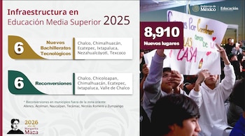 De acuerdo con la información presentada por la SEP, para 2026 se contempla la creación de 4 mil 950 nuevos lugares en educación media superior en el Estado de México, mediante la construcción de tres nuevos bachilleratos tecnológicos, así como la apertura de cinco ciberbachilleratos.