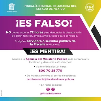 La Fiscalía del Edomex advierte que ningún servidor o servidora pública está autorizado a exigir que transcurra cierto número de horas para iniciar un reporte, ni mucho menos a solicitar pagos, cuotas o dádivas. Todos los trámites relacionados con la denuncia por desaparición son completamente gratuitos.